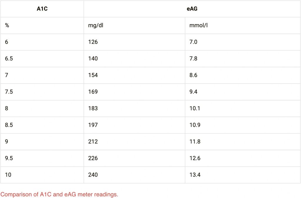 Estimated average glucose (eAG) is also another term for A1C and can be found on a glucagon meter used to test blood sugars at home.